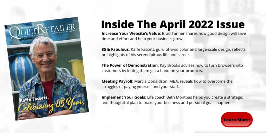 The April issue is full of ideas and information to help you and your shop! Find how good design will save time and effort, increasing your website’s value, hear reflections on the serendipitous life and career from Kaffe Fassett, how demonstration can turn product browsers in to customers, and much more! We hope you enjoy this issue!! Learn More > > >